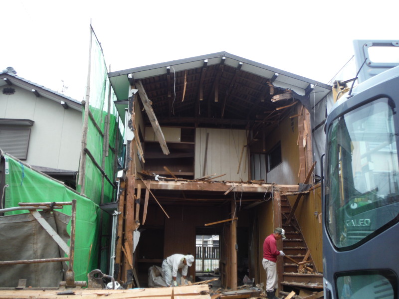 解体時に発生する破片や屑等が隣家へ行かないよう十分に対策を施し作業を行います。 少ない空間で解体作業を行うため小さめの重機で解体作業を行い、前面から徐々に解体と破片の運搬を行っていきます。解体工事の手順【着工~更地まで】