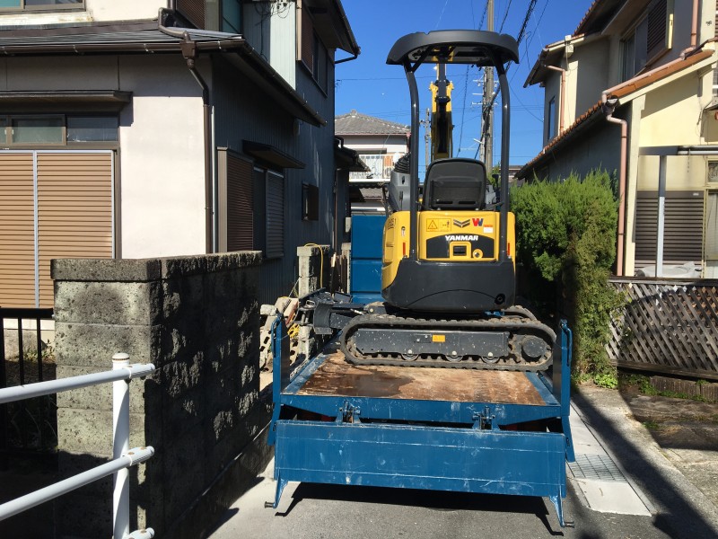 重機は庭になんとか入っても、垣根があるのでこのままでは積み込みができない状況です。