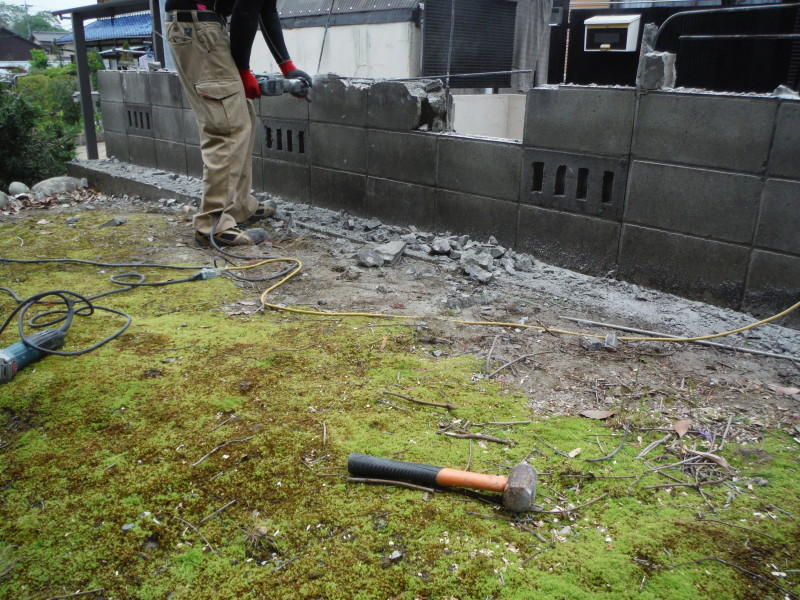 ブロック塀は下段一部を残す撤去工事のため、すべて手壊しで行います。