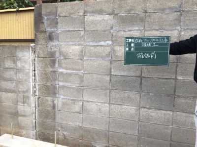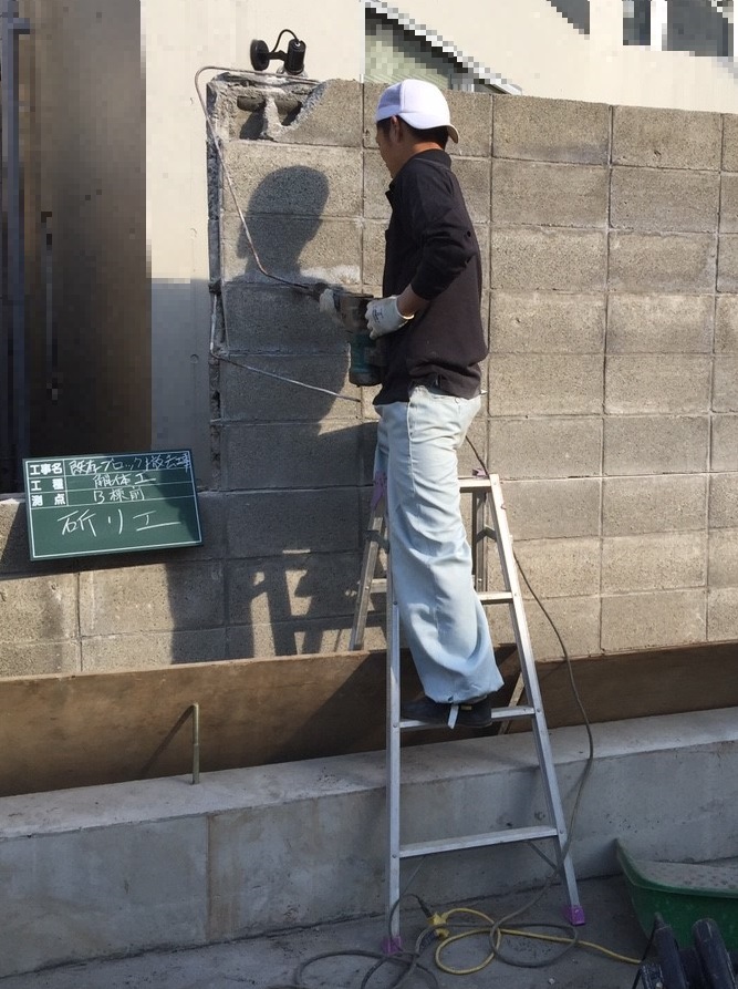 住宅まわりの外構フェンスを新設するため、老朽化したブロック塀の部分的な手壊し解体です。