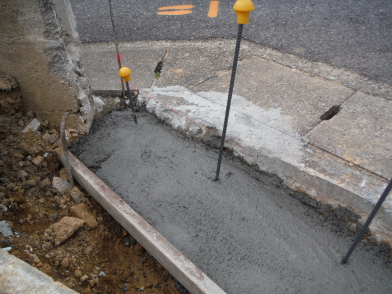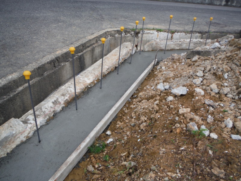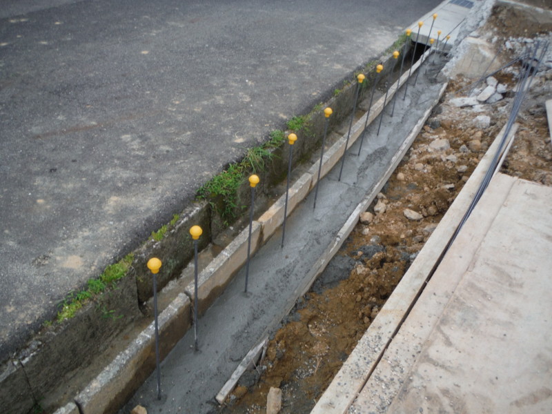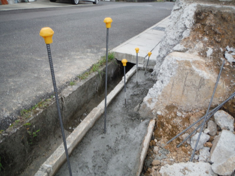道路沿いには、ブロックを新設しました。所定の位置にコンクリートの基礎を打設し、その際に鉄筋をしっかり打ち込むことが重要です。