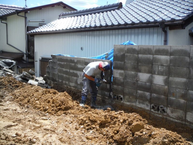 次に、隣地との境界に注意しながら、既存のブロックを崩していきます。