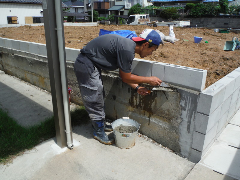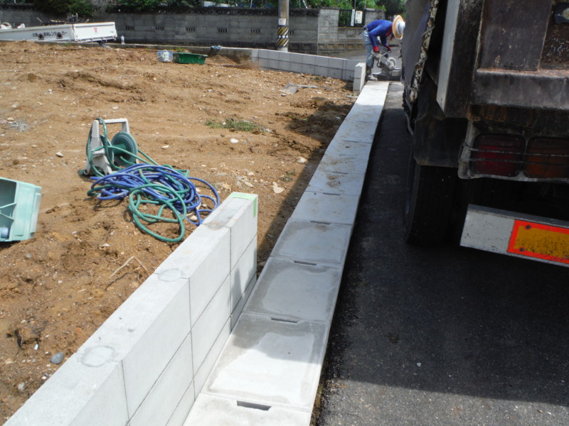 そのあと、打設したコンクリートの基礎の上にブロックを積み上げていきます。