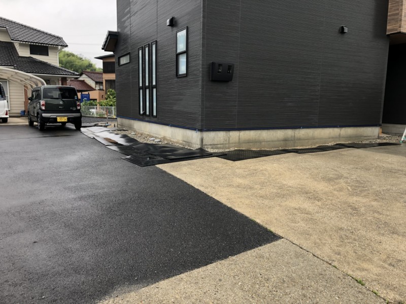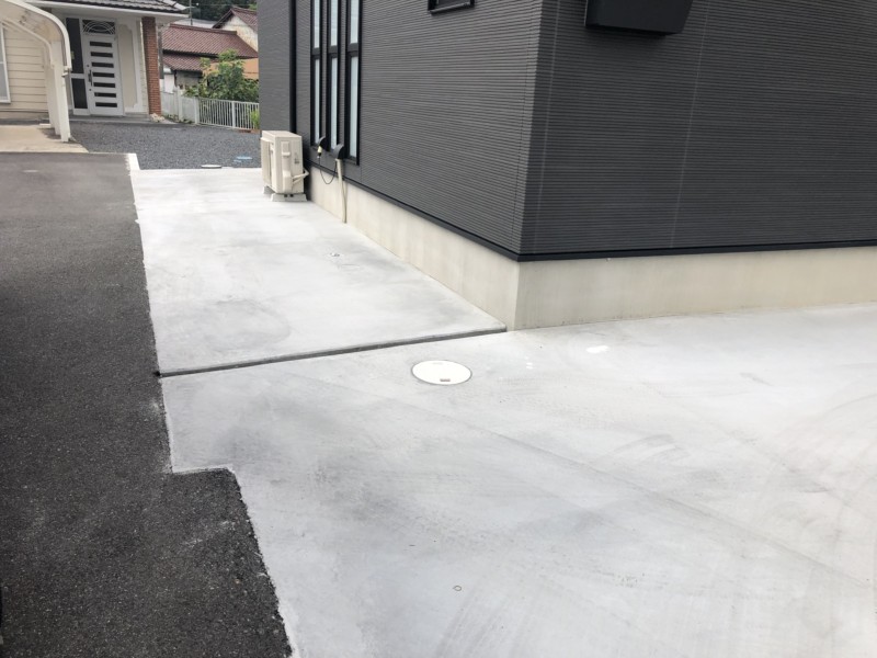 お庭へ続く階段や庭スペース、家周りの犬走と全てが綺麗に仕上がった上、しっかりと確保できた駐車スペースに、お客様には大変喜んでいただきました。