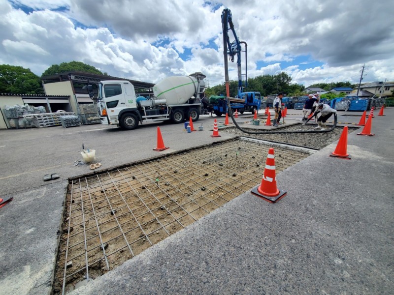 頻繁に通行する部分のアスファルト舗装は老朽化するのが早いため、今回はコンクリートにて補修工事をしたいというご要望でした。まず今回残す部分に白線を引き、傷つけないよう注意しながら、コンクリートを打つ箇所にカッターを入れました。その後コンクリートを剝がしながら、砕いたコンクリートガラや余分な土を搬出していきます。今回は強度を上げるために鉄筋を配して、土間の厚みも200㎜で打設いたしました。休日中の工事対応だったため、生コン打設までをスピーディに段取りし、無事に予定通り完工することができました。