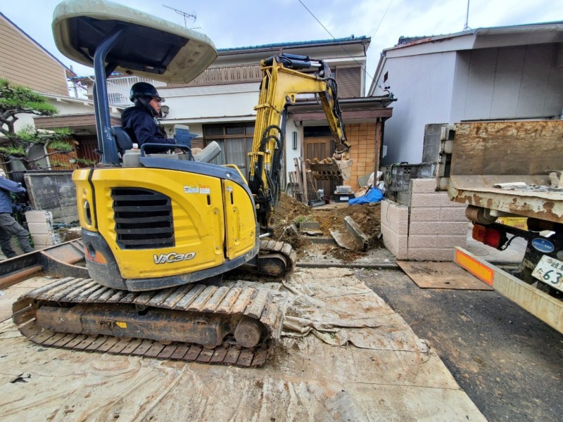 道路と敷地の境界にフェンスが設けられており、道路面より50cmほど高くなっているお家のお庭を、駐車場にリニューアルする工事を行いました。現在の駐車場スペースも土間を解体して、もう一度コンクリートで仕上げます。また、建物周りの犬走の雑草にも悩まれているとのことでしたので、防草対策として土間コンクリートを打つことにしました。