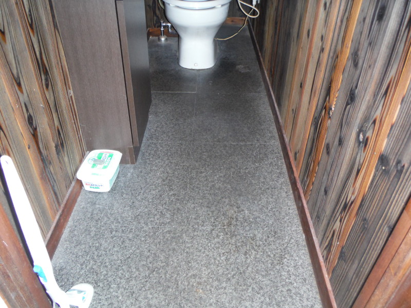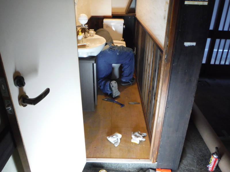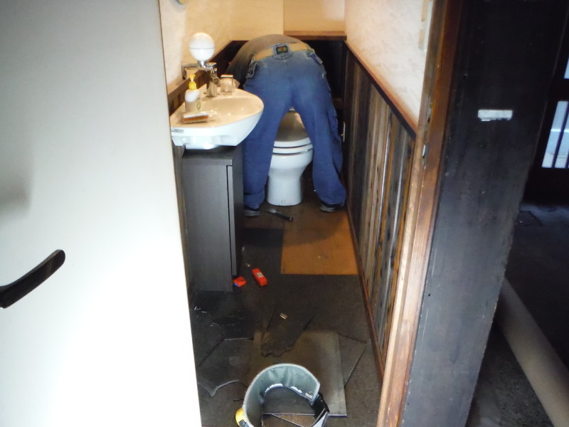 先日の岐阜市の店舗内装解体にくわえて、トイレ床のクッションフロア張り替えを施工しました。