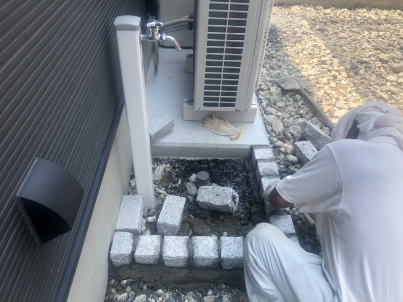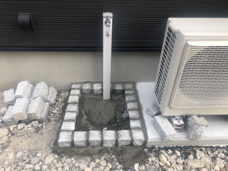 土間打ちの前に、立水栓をつくっていきます。見切りは御影ピンころです。