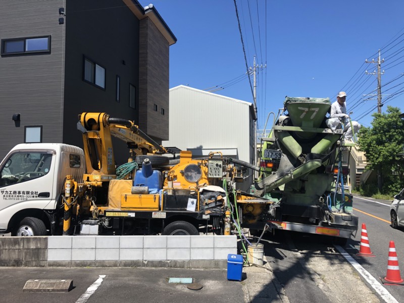土間の下地を整えて、生コン車とポンプ車で打設していきます。