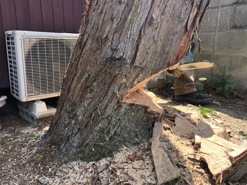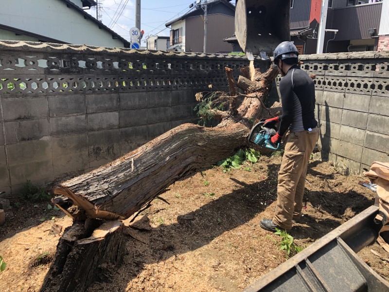 重機と併用で、太い幹を切り倒します|岐阜市の庭木伐採