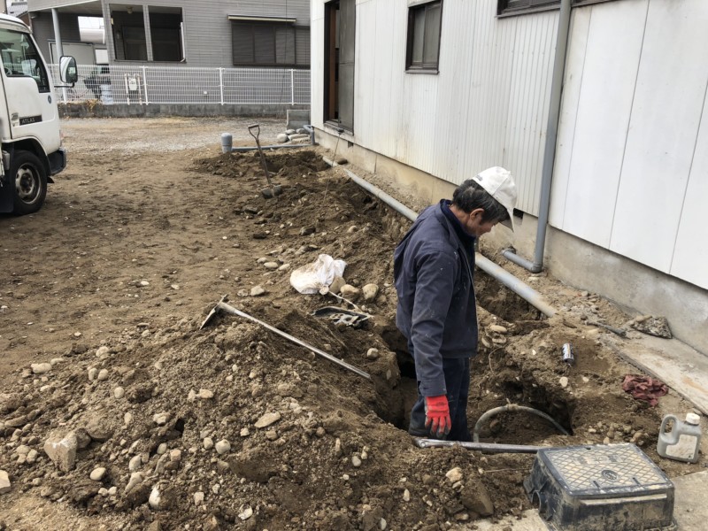 建物が更地になり、続いては下水管と井戸の配管の復旧作業です。