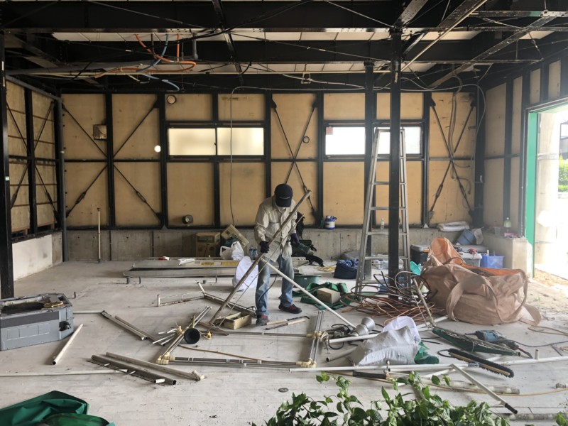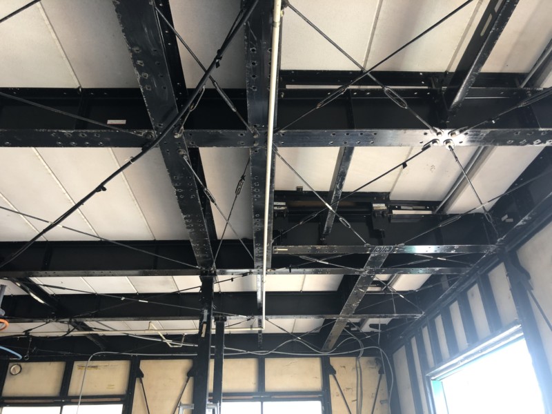 今回ご紹介するのは、美容室の原状回復工事です。賃貸物件を借りた当初にもどすため、天井や壁をすべて撤去し、鉄骨の構造のみの状態に戻します。