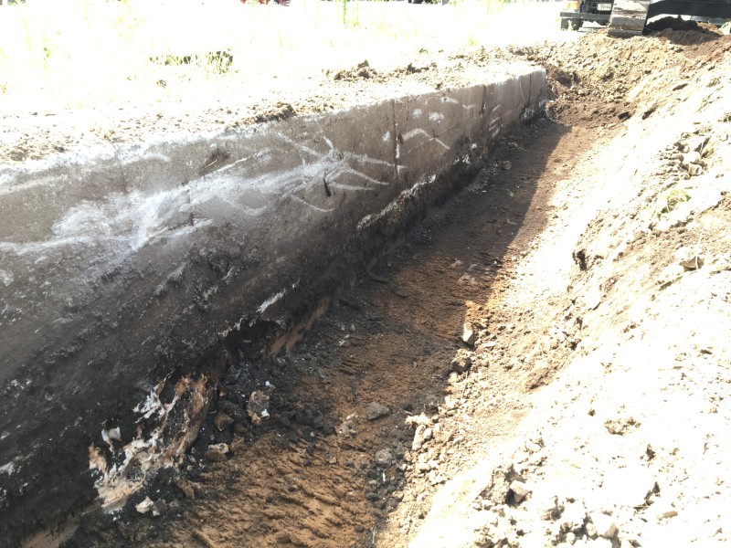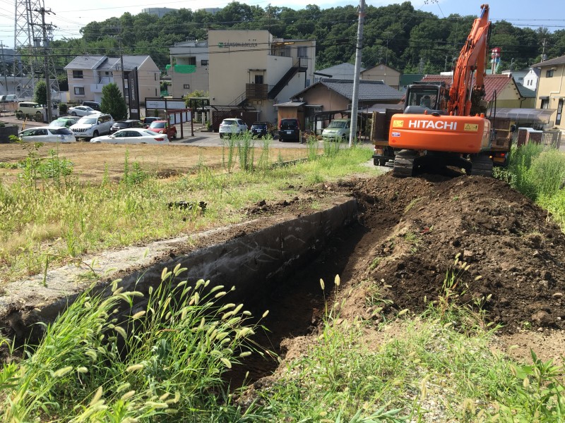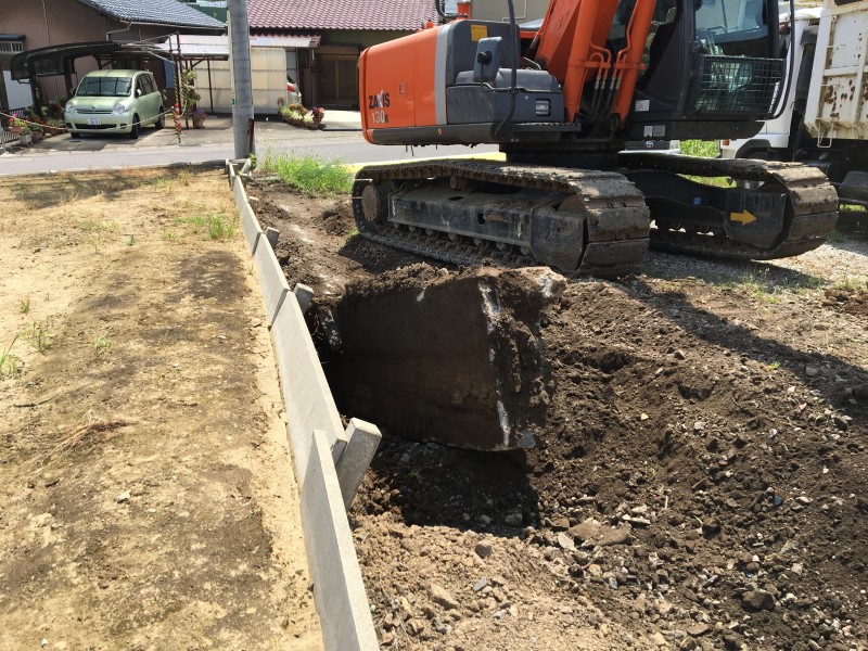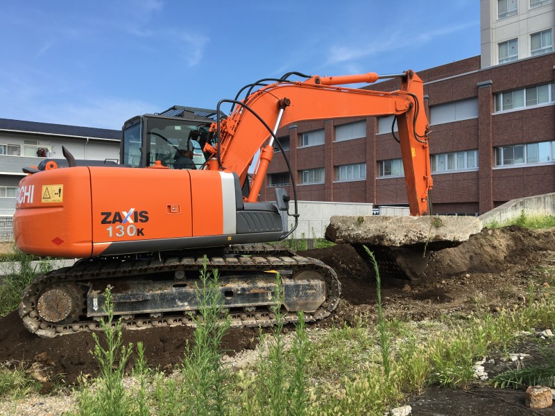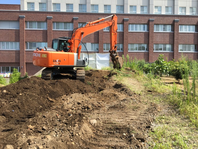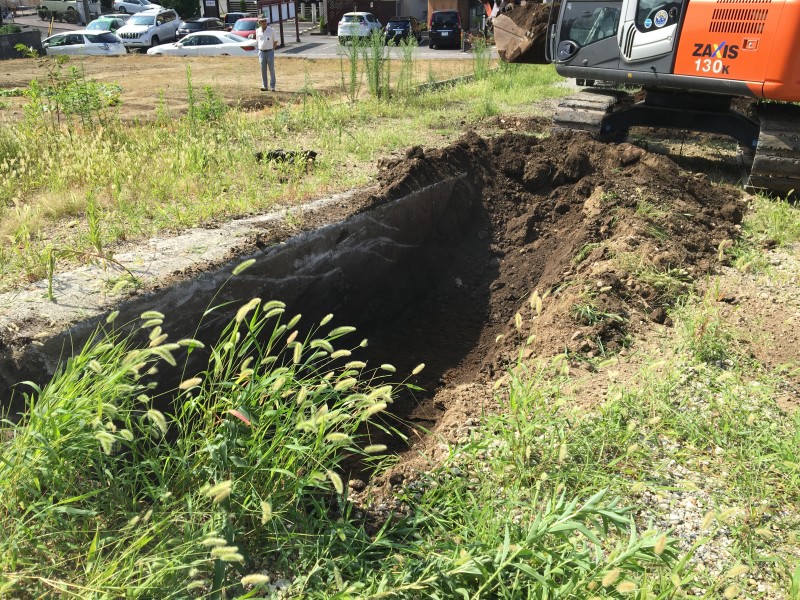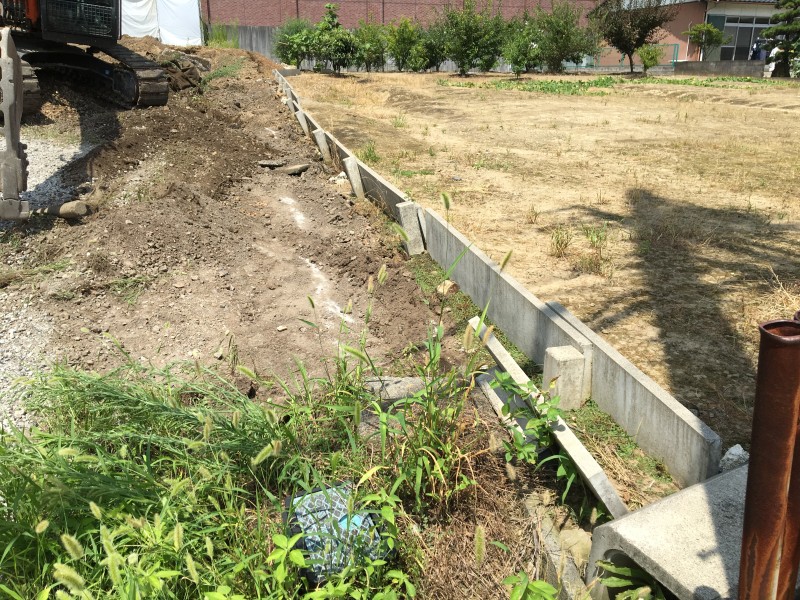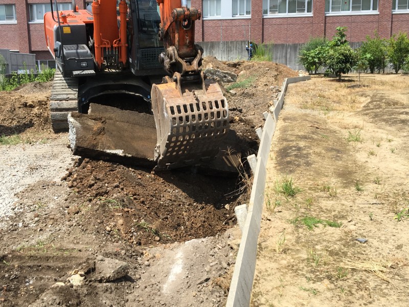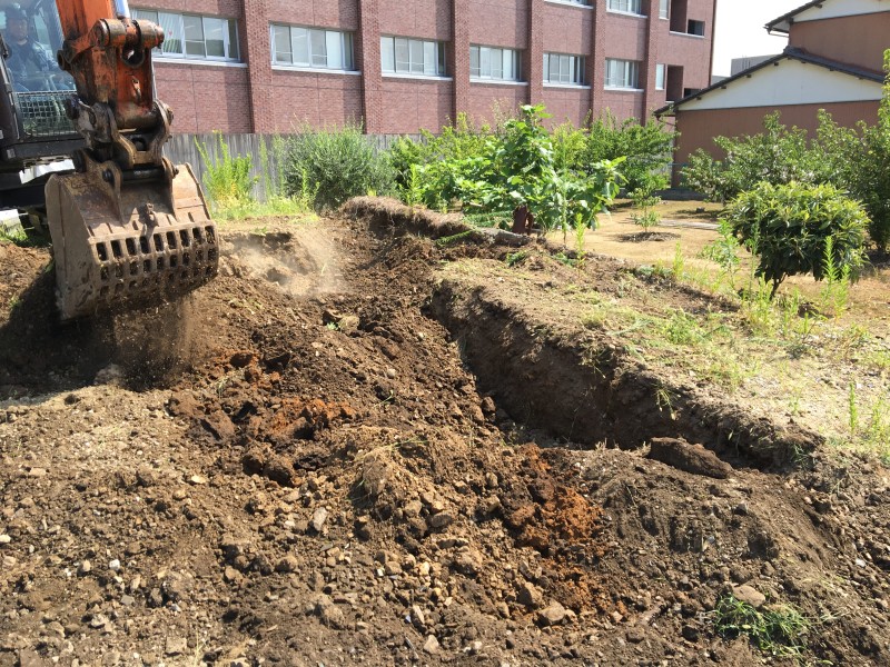 まずは中央部のコンクリート擁壁がどれくらい埋設されているのか、ユンボで周辺を掘りながら確認していきます。