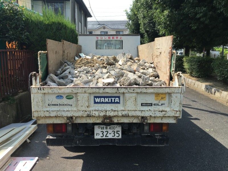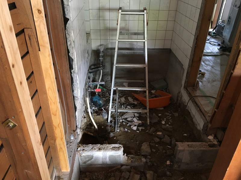 風呂桶を撤去し、土間コンクリートをハツリ、ガレキを外へ出していきます。