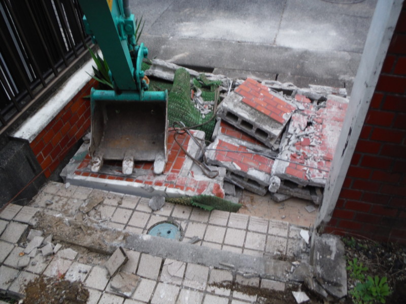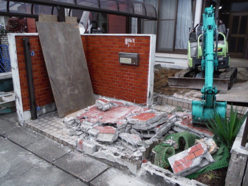 まず初めに、コンクリートブロック製の門扉を重機で取り壊していきます。