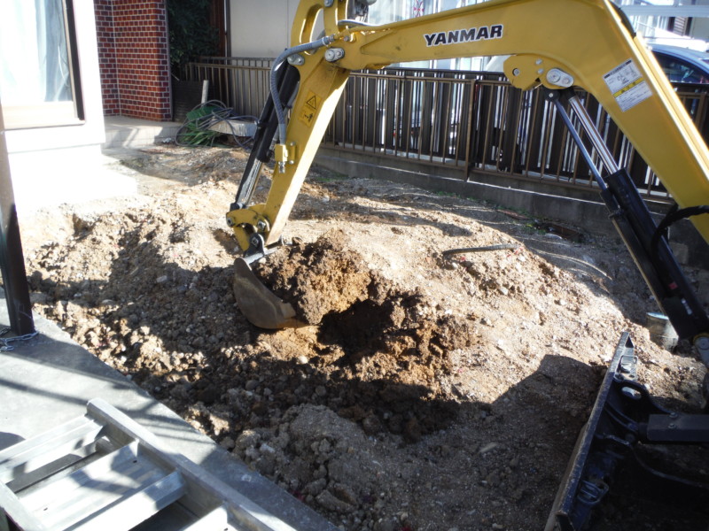 まだカーポートの高さより土が高いため、重機ですき取っていきます。