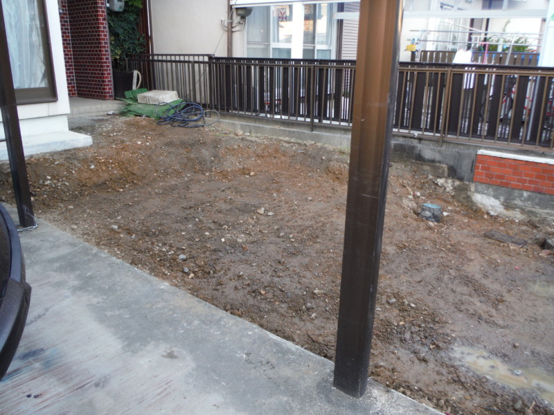 アプローチ部分の敷地レベルが駐車場より少し高くなっているので、残土も撤去してフラットにしていきます。