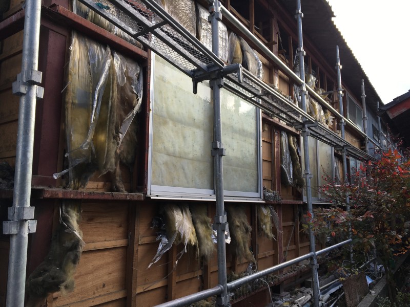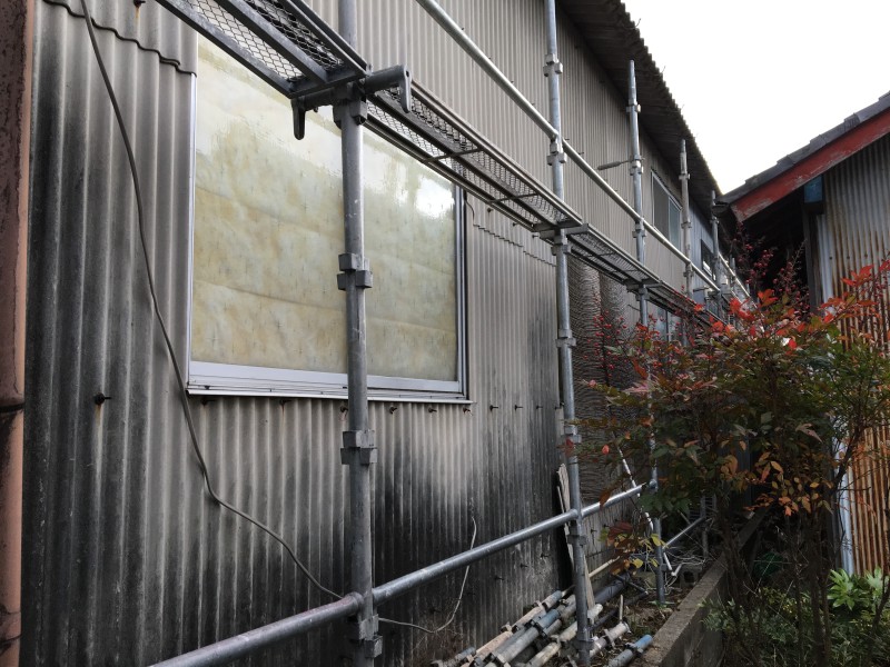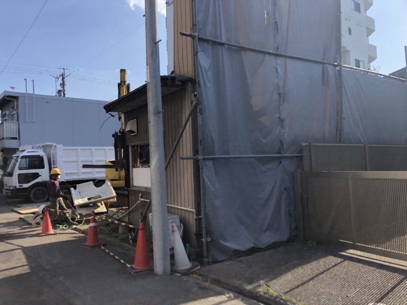 まずは近隣の方々にご迷惑をおかけしないよう、鉄パイプを組んで養生シートを張りました。