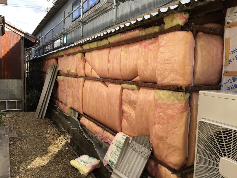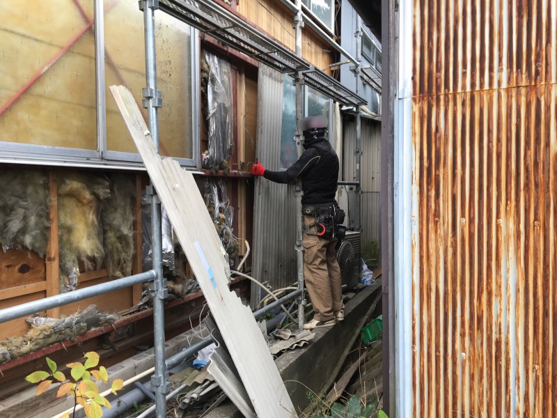 日頃からお世話になっている建築屋さんからのご依頼で、鉄骨倉庫の外壁材の撤去工事です。