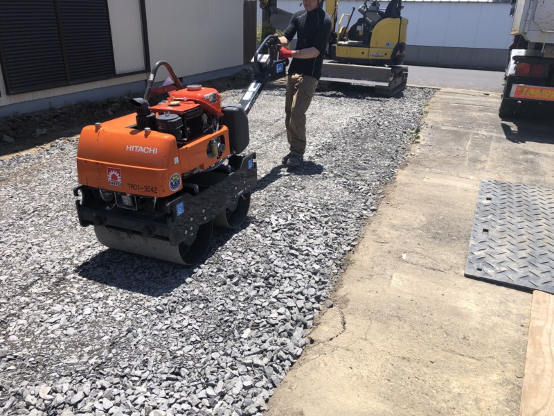 解体後は駐車場として活用するため、整地をしたら、砕石をまんべんなく敷いていきます。漏れなく砕石を敷き詰めたら、機械で転圧し、しっかり地固めをして工事完了です。