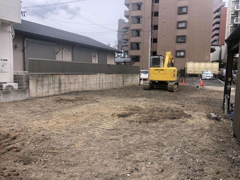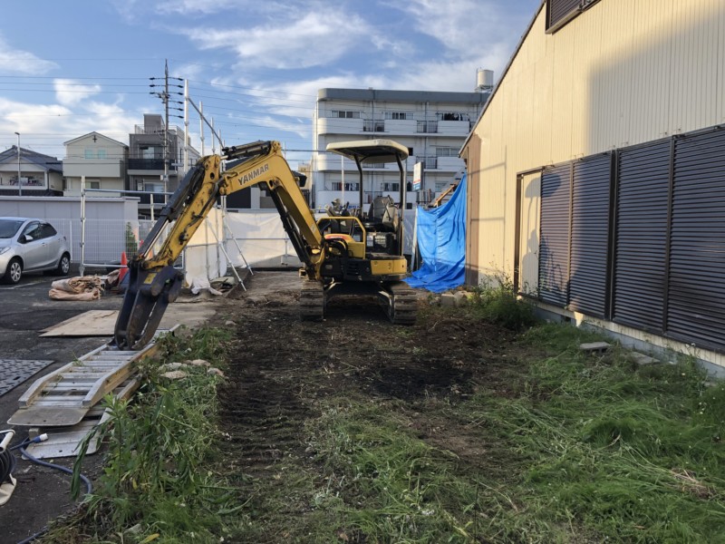 いよいよ重機を入れての解体開始です。上部から順に解体していき、廃材は全てトラックに載せて搬出します。解体後は重機で掘削しながら、地中の埋設物やゴミも撤去していきました。全ての不要物の撤去と整地の仕上がりを確認して、無事完工です。