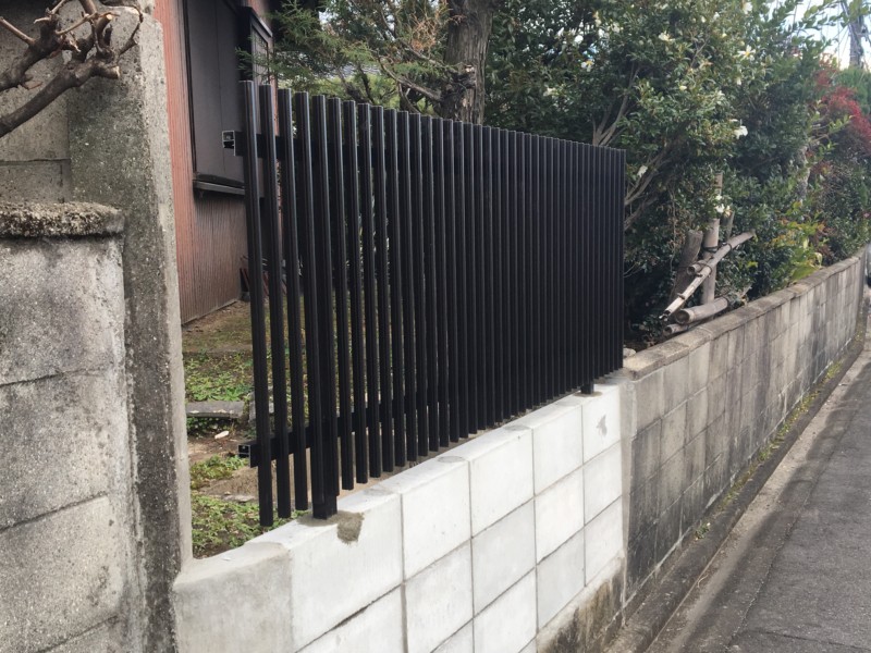 一部ブロックが破損している箇所もあるため、水平をとって、鉄筋を補強した上でブロックを補修していきます。その上に縦格子のアルミフェンスを設置したら、無事に完工です。早急な対応とすっきりとした仕上がりに、お客様には大変ご満足いただきました。