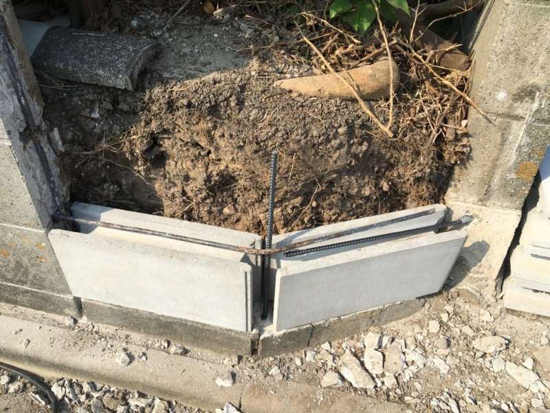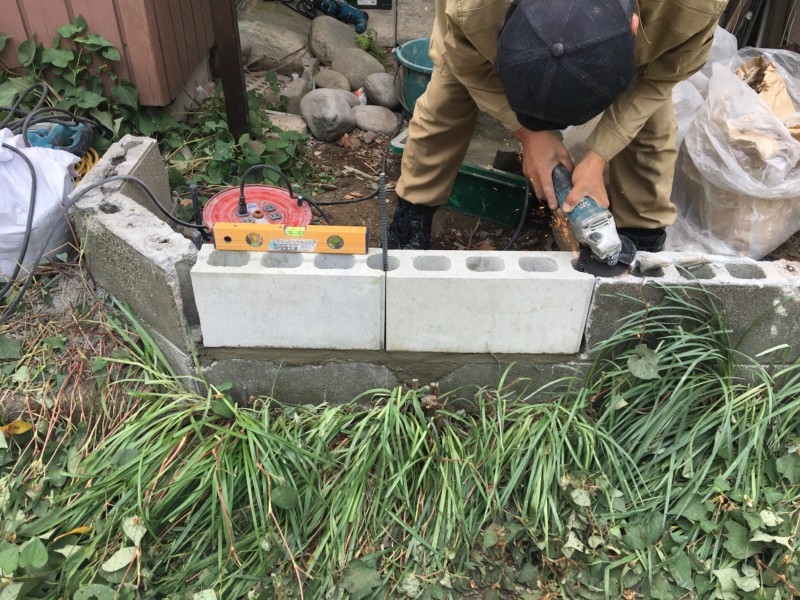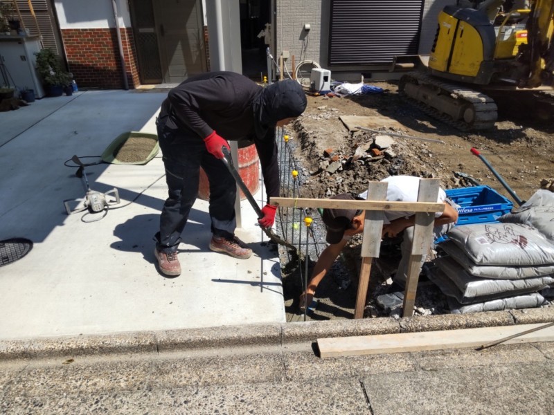 まずは傾いているブロック塀を解体します。ドアや角の塀を含め、傾いている箇所のみを補修するため、必要最低限の解体を行いました。また同じような傾きを発生させない対策として、縦横方向の鉄筋の数を増やす強化に加え、両端にアンカーを打ち込み補強を加えました。