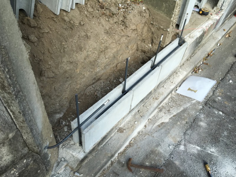 次はブロックの新設工事です。鉄筋の連結には結束線で結び、ブロックの間はモルタルを充填します。角部分も含め、全ての隙間をコンクリートで丁寧に埋め、強度を上げ、老朽化対策を行いました。