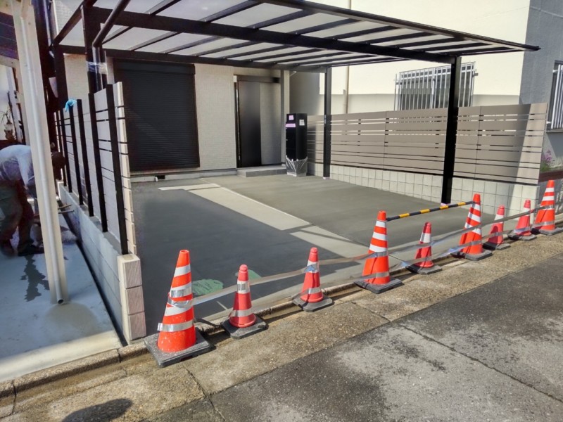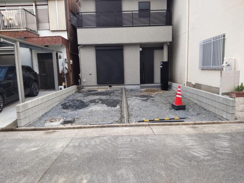 まずは一棟分のお庭と駐車場、及び隣地との境界ブロックを解体後、カーポートを新設し、土間コンクリートを打設しました。その後、配管を傷つけないように気を付けながら、二棟目の駐車場を解体後、境界ブロックと目隠しフェンスを再設置いたしました。機能門柱ポスト(宅配ボックス)も設置したいとのご要望でしたので、カーポートと合わせて設置し、土間コンクリートを打設の上、金ゴテにて丁寧に左官いたしました。二棟分共に、理想通りの駐車場が出来上がったとお客様には大変喜んでいただきました。