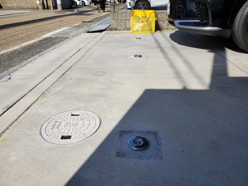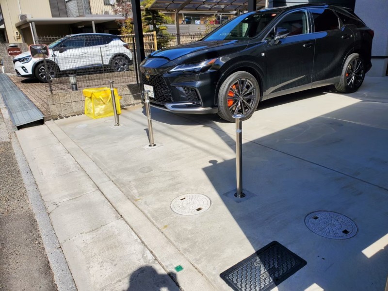 車止めポールを設置する道路沿い近くにライフラインの配管と桝がありました。ライフラインが干渉しないように事前に調査したうえで設置位置を選定しました。設置部の土間コンクリートにカッターを入れてはつり、車止めポールを設置し、根元をモルタルで仕上げて完成となります。工事は1日で終わり、納車前に完成し、喜んでいただきました。