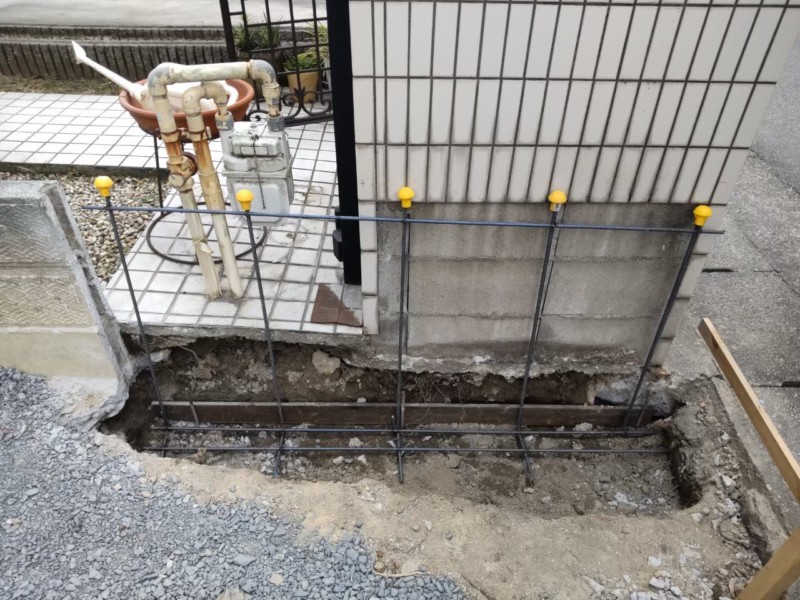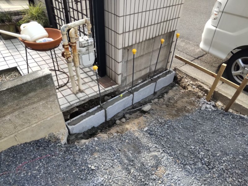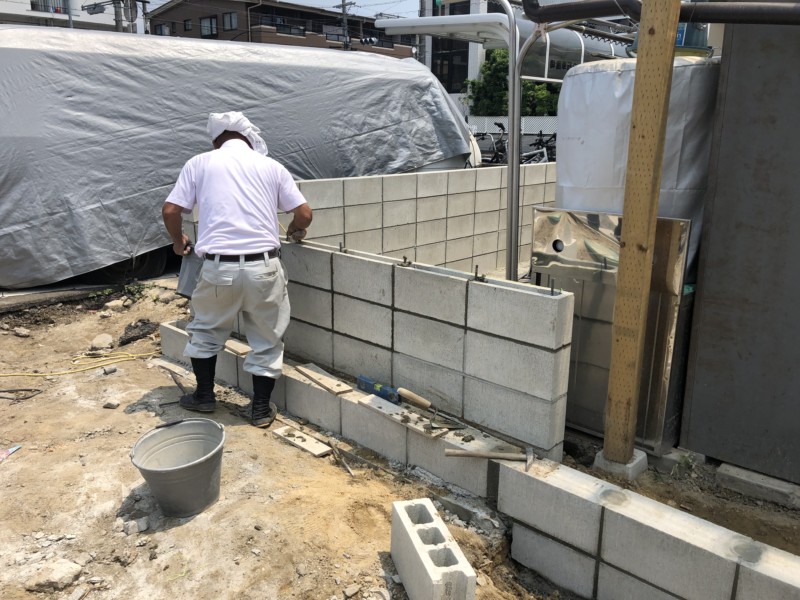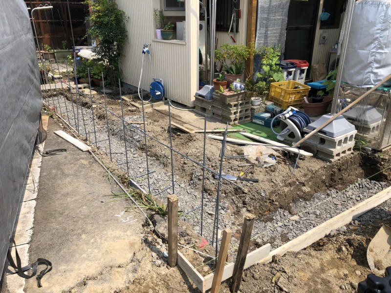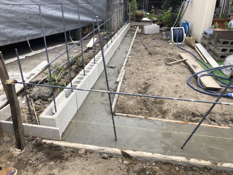 隣地の方の了解のもと、境界沿いにブロックを積んでいきます。先ずは基礎となる部分の掘り方作業からです。基礎下には砕石を敷いてしっかり転圧しました。鉄筋も所定の位置に抜かりなく配置していき、水糸でラインを合わせながら、ブロックを据えていきます。長手方向にも同様にブロックを積んでいきました。隣地境界はとても大事なエリアなので、地中の基礎も越境しないよう注意が必要です。お隣同士2つのラインでブロックを積み終えました。