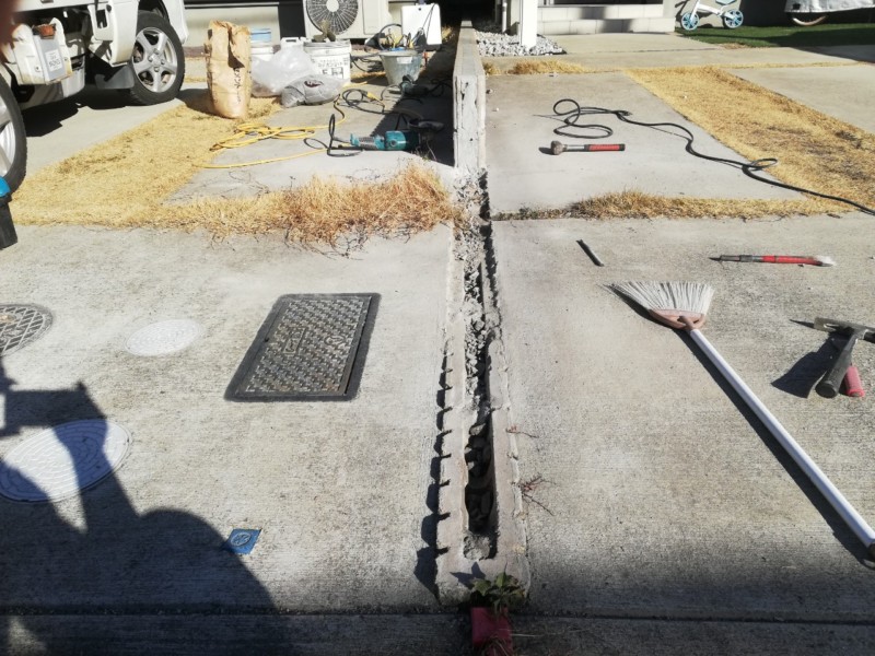 まずは、ブロックの撤去です。残す部分を傷つけないようにカッターを入れてから、不要な部分をコンクリートハンマーで砕いていきます。砕いたガラは、集めてトラックで搬出しました。周囲との兼ね合いもあるため、作業はとにかく慎重に行います。