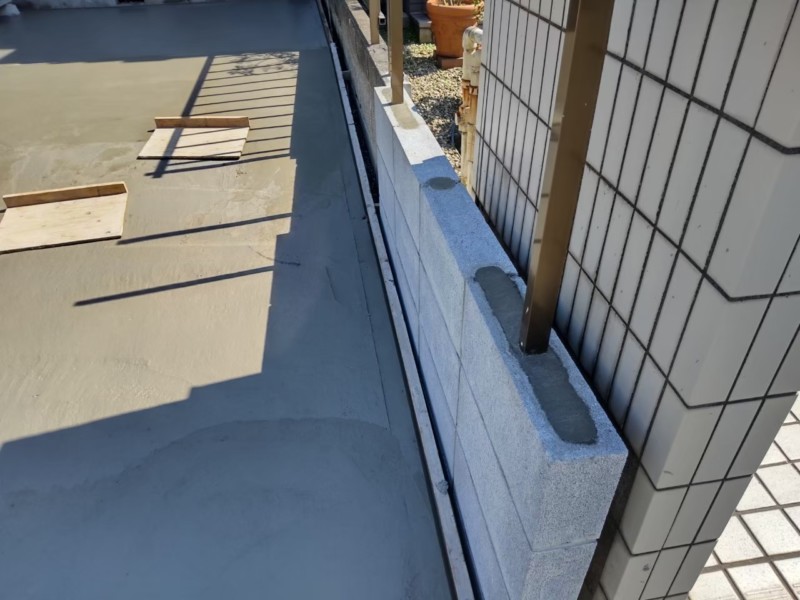 撤去を終えたら、モルタルを練り、木枠を当てた立ち上がりブロックの断面に丁寧に塗っていきます。はみ出ないように真っすぐ塗り、きれいに左官したら、今回の工事は完工です。