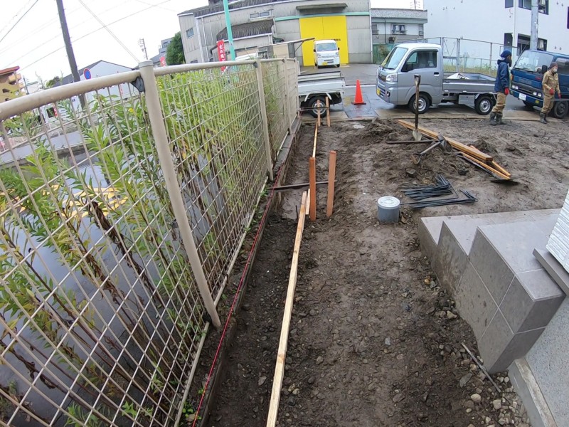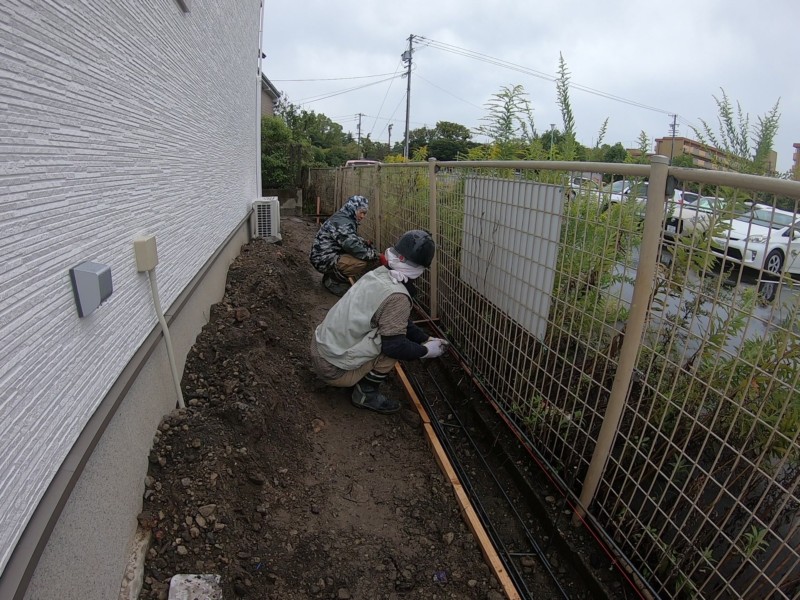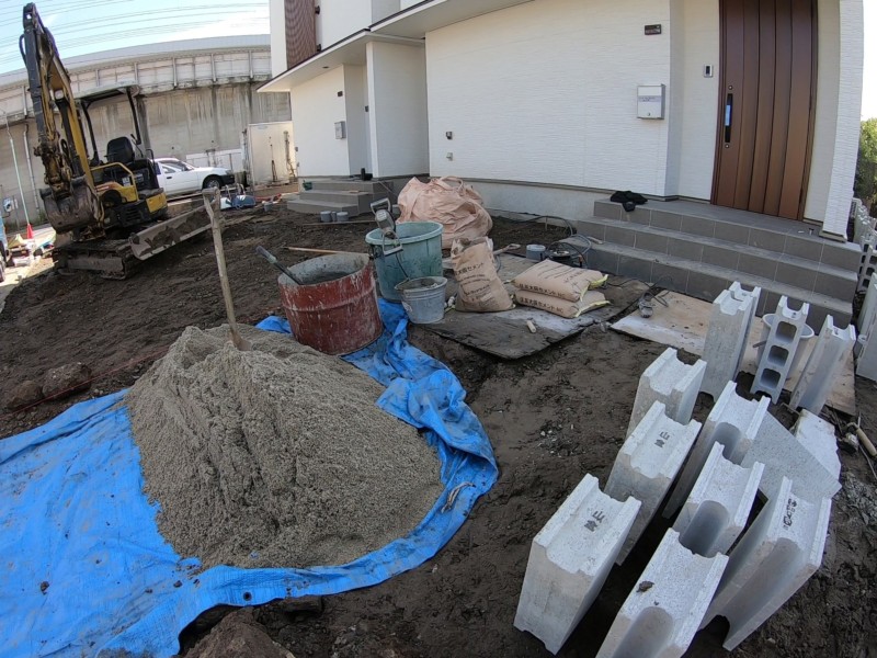 今回は『隣地との境界にブロックを積みたい』 というご要望でしたので、境界を決定する【杭】に沿ってブロックを積んでいきます。