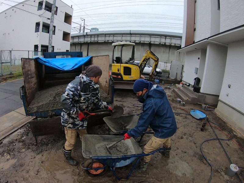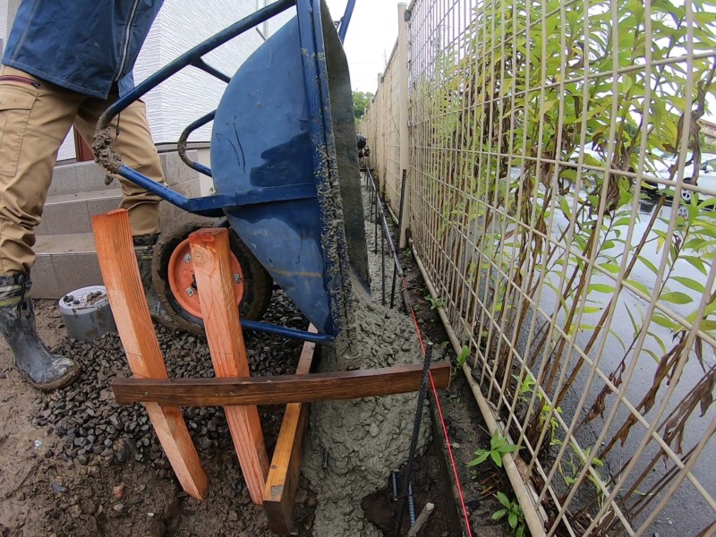 基礎の厚みを確認しながら、コンクリートを流していきます。