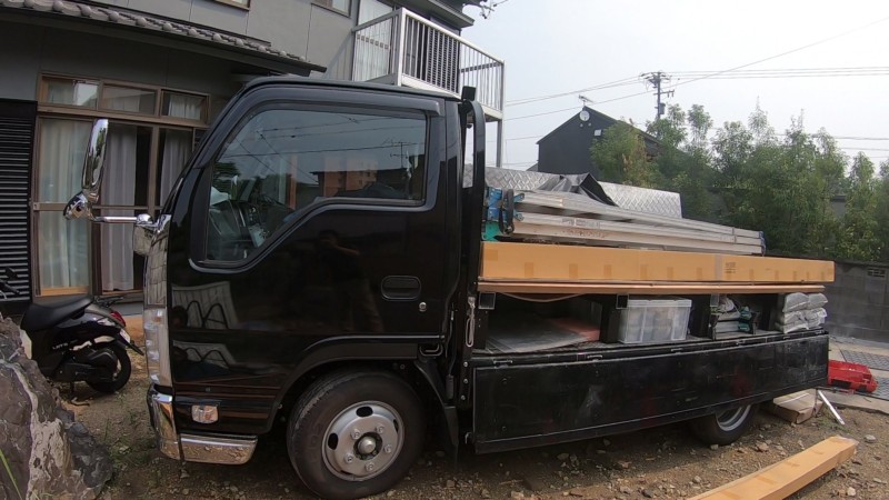 まずは庭木をチェンソーで切っていって、ダンプへ積み込みます。