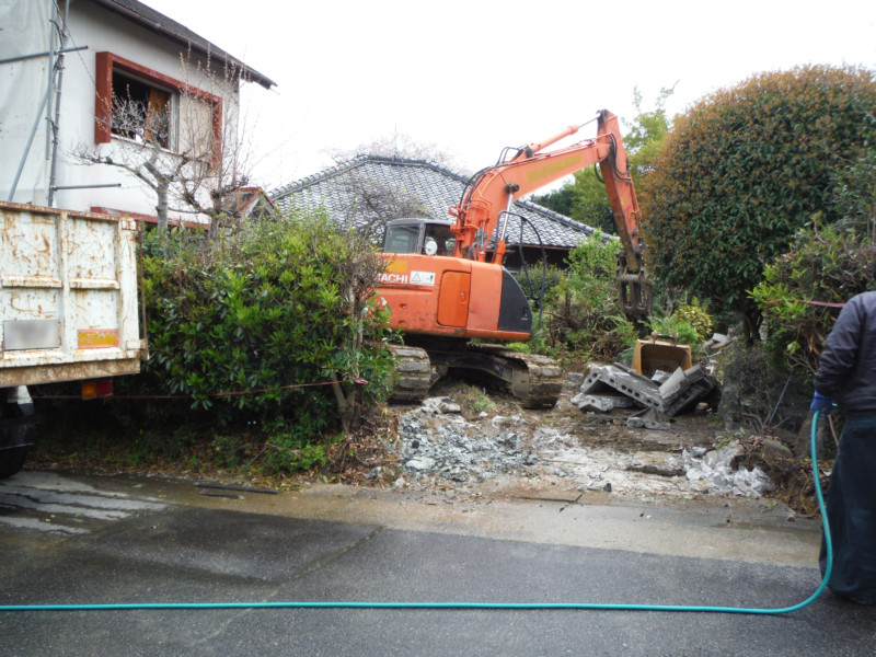 ホームページから直接ご連絡いただきました。土地の売却による解体工事です。『お隣との境界のブロック塀と大きな庭石も撤去して、キレイに整地してもらえたらとても助かります』ということで、着工に至りました。住宅密集地で敷地いっぱいに建物が建っている為、養生シートを貼り、防塵対策を十分に行います。また、敷地内で安全に作業が進められるように、先に離れの平家を解体し、重機での作業スペースを広げました。