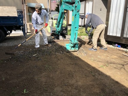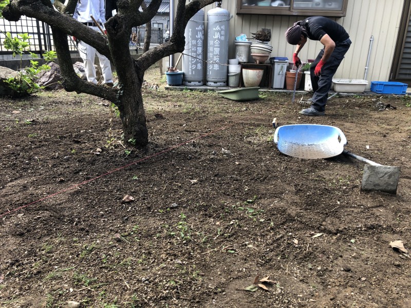 お庭の撤去工事がおわり、このあと防草シートを敷くので、平らになるようにレベルを調整していきます。