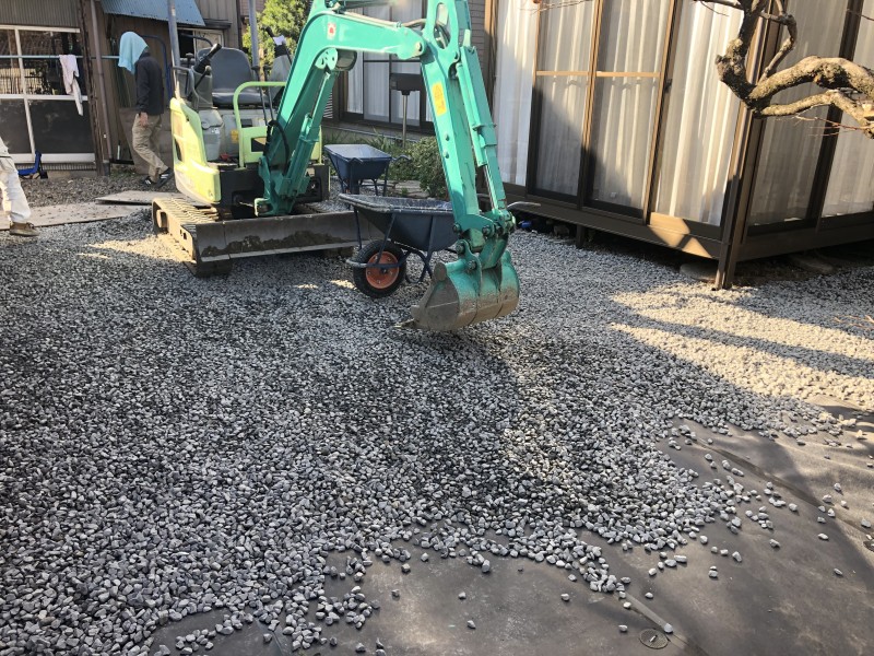 砂利はダンプで2車あるので、ミニ重機で敷きならしていきます。