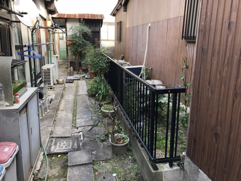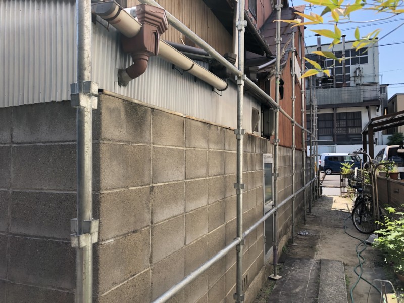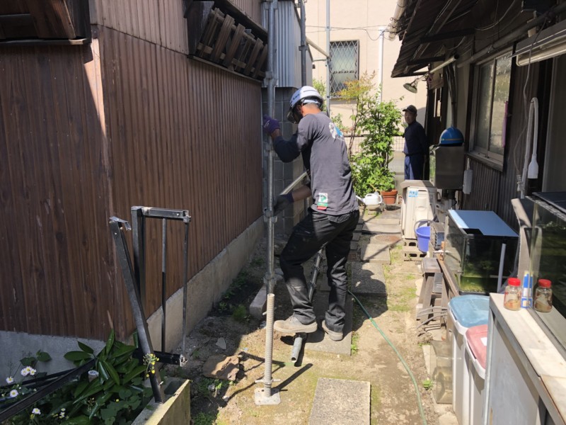 今回の物件は、敷地いっぱいに建物が建っているので、隣地の使用許可を頂いて足場を建たせて頂きました。