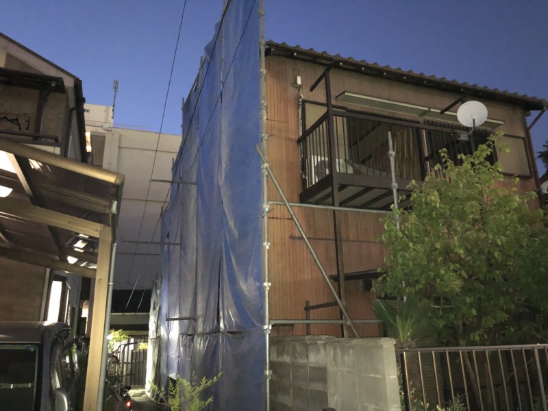 ご近隣への防塵対策の足場設置は完了です。