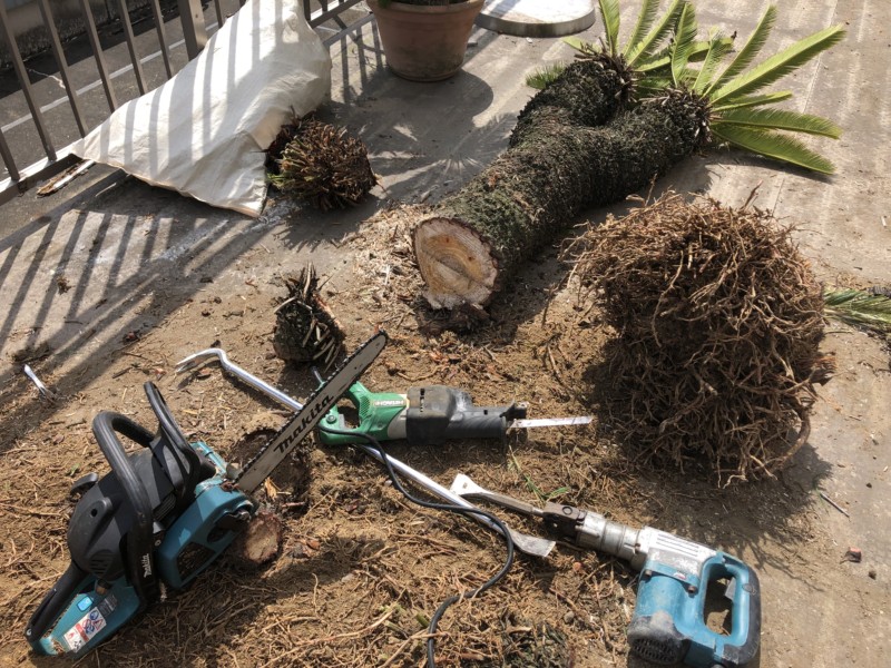 続いては植木の撤去です。植木はエレベーターでの搬出にはサイズが大きすぎるため、運びやすいサイズにチェンソーで切断します。根っこについた土は落としていきます。こちらも廃材を袋に詰めて搬出します。