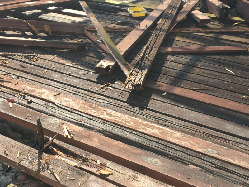 ウッドデッキの状態は、苔がついていたり、ボロボロになっていたりとかなり老朽化が進み危険な状態です。