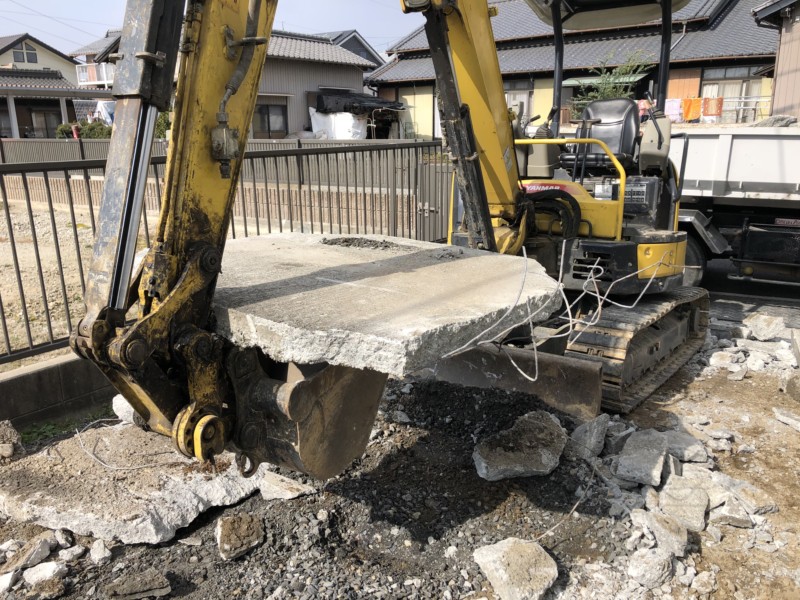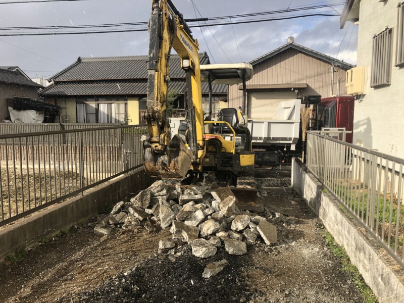 駐車場のため、厚みは10cmほどのコンクリートでした。 まだそれほど劣化していないため、ブレーカーでしっかり砕いてから、積み込み作業します。