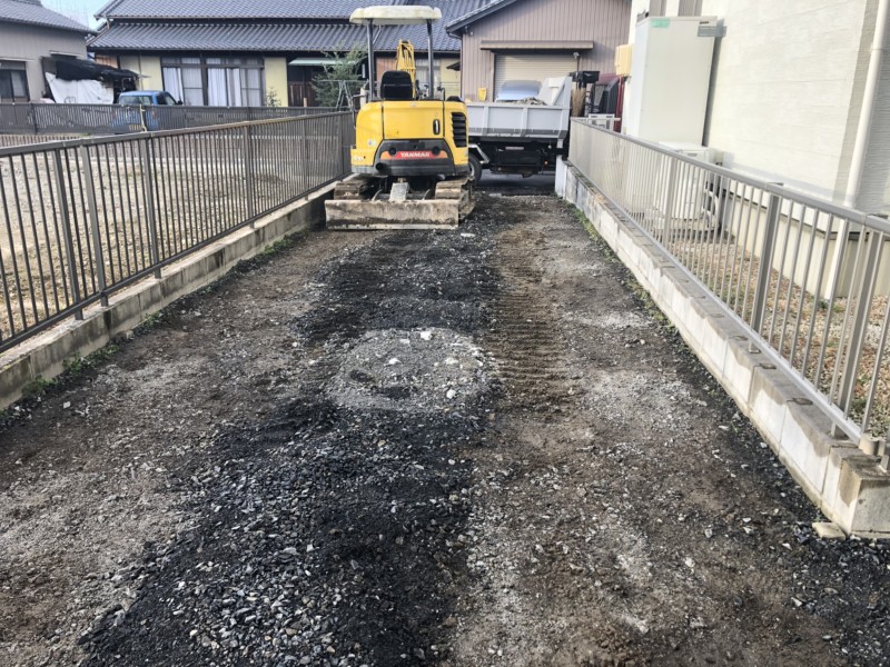 正面の道路から敷地へ奥まった乗り入れ箇所のコンクリートを撤去します。 長さ20mほどで、真ん中の砕石部分がどうしても駐車場として使いづらいため、もう一度コンクリートを打ち直すための解体工事です。解体工事の【費用事例】