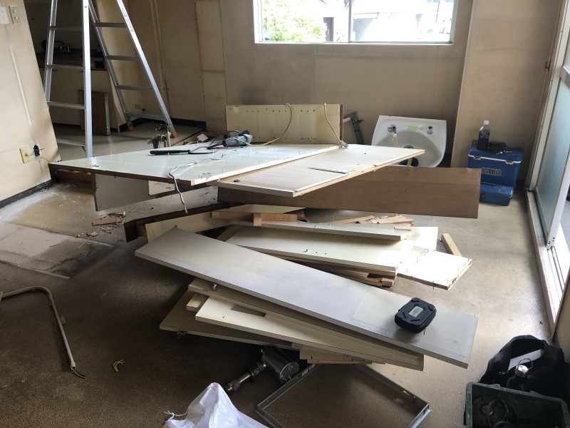 大工さんが制作した間仕切り壁を撤去します。