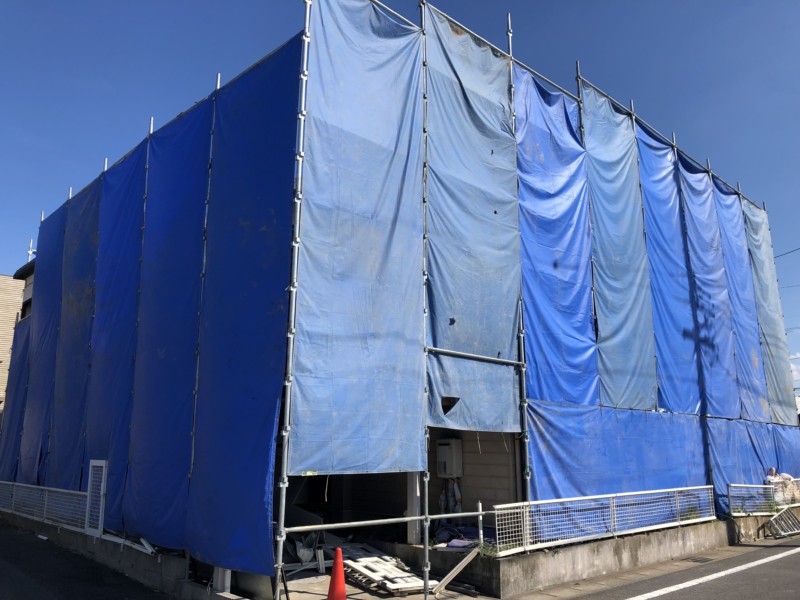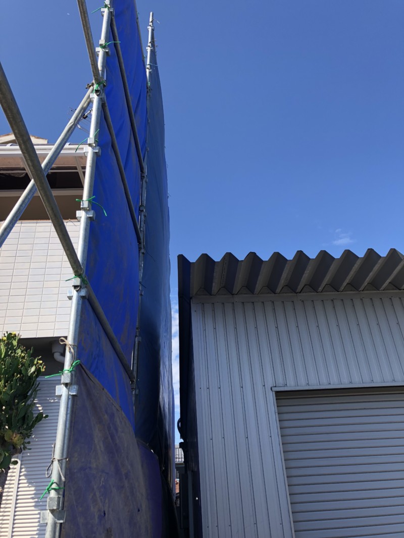 まずは防塵対策でお隣さんにご迷惑おかけしないように、養生シートでしっかり対策します。