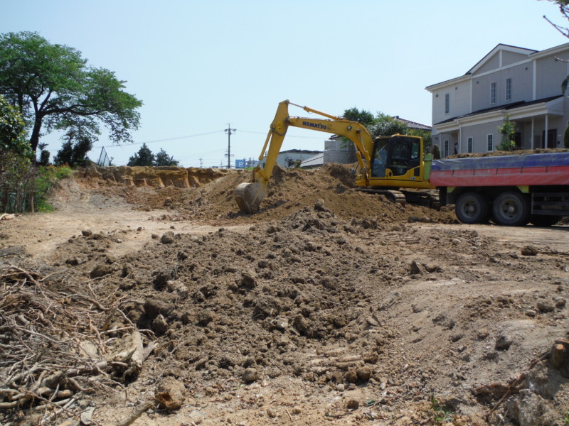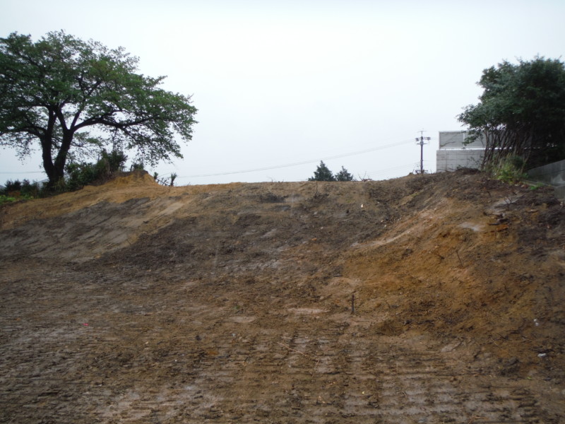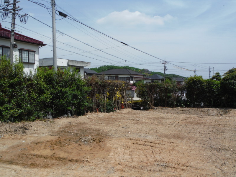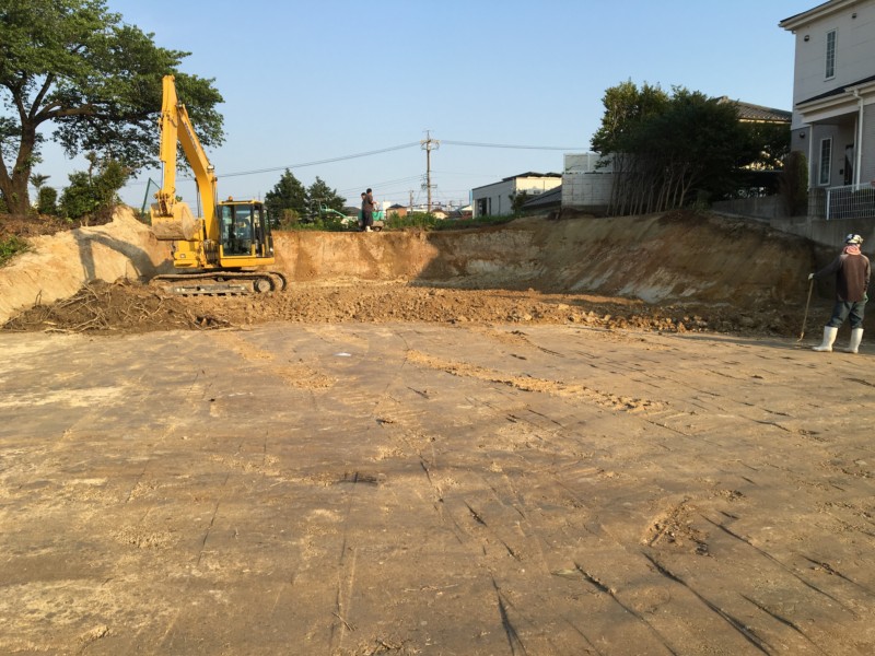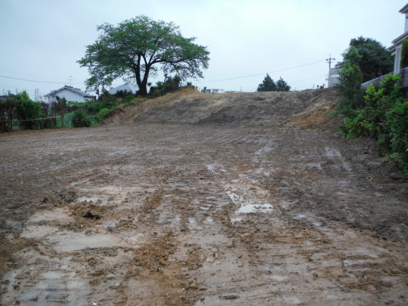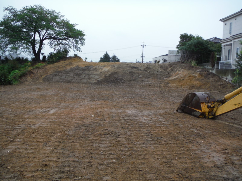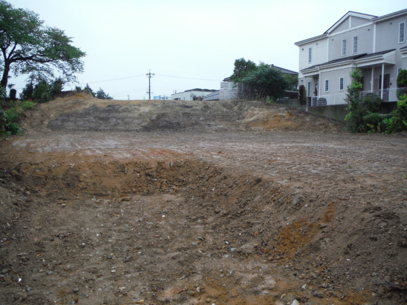建物を解体し整地された状態です。ここから余分な土を削って搬出していきます。 建物が建っていた部分は窪んでいるため、平にしなければなりません。 隣地との境もキレイに整えます。
