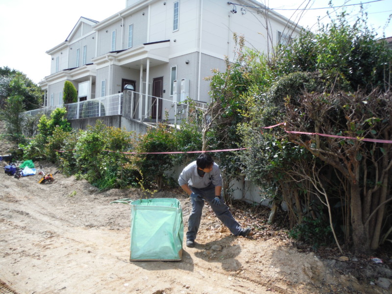 敷地の土が多いため、残土のすきとり工事を行います。 1/4が山のため、崖地部分を削って家が建てられる面積を広げていきます。 残した庭木の周りをキレイに整えていきます。
