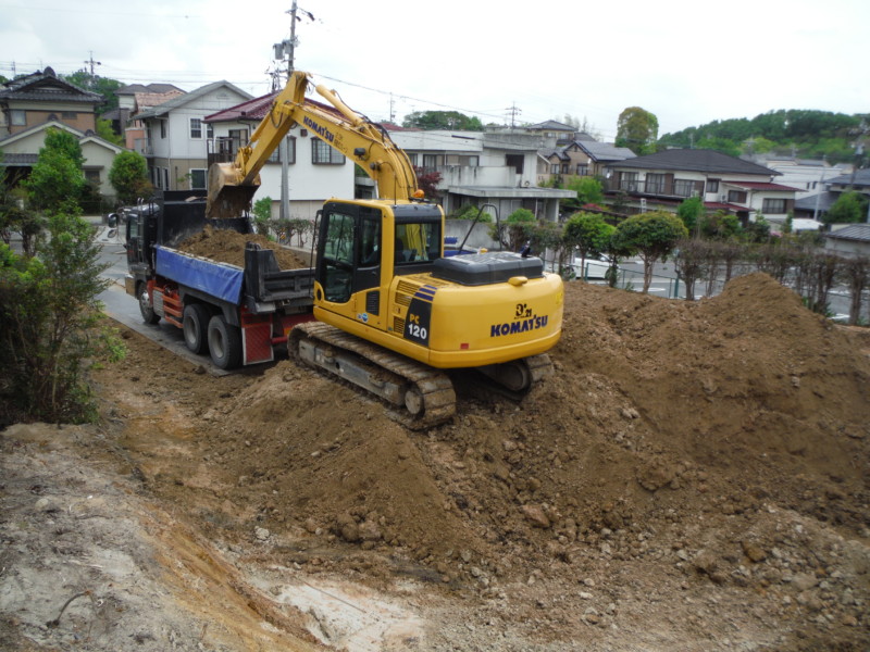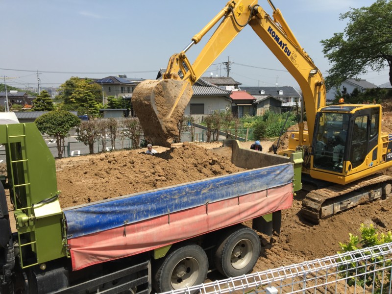 削り取った土をダンプに載せ搬出していきます。 大量の土を搬出するため、大型のダンプカーを1日7車手配しました。 【費用事例】名古屋市天白区の残土処分すきとり工事   この作業を繰り返し行い、1日7往復、およそ50車分をすきとり、搬出しました。 【費用事例】名古屋市天白区の残土処分すきとり工事